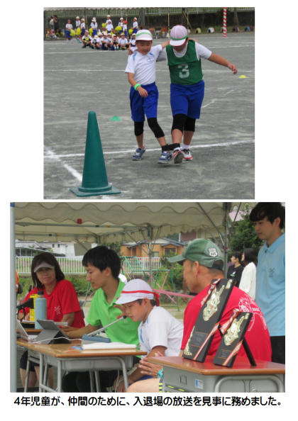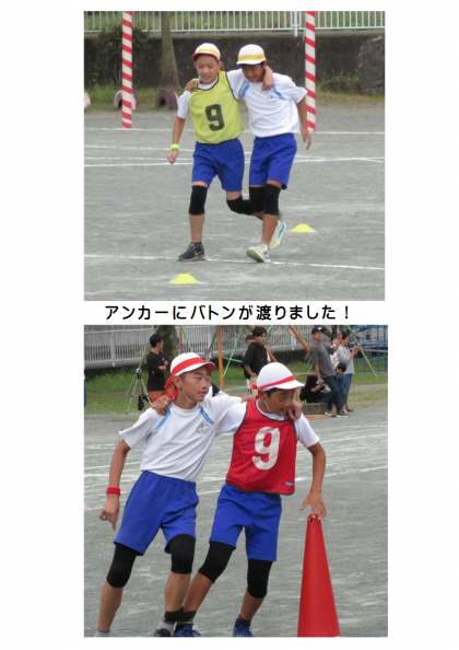 アンカーにバトンが渡りました。みんなで団結して全力で競技に取り組みました。まさに、「君とともにかけぬけた」4・5・6年生でした。