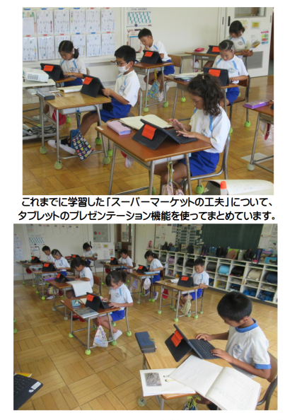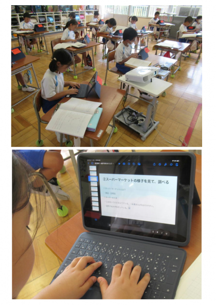 10月6日(金) 3年生の社会 公開日 2023/10/07 更新日 2023/10/07 できごと 3年生の社会では、めあて「これまでの学習(スーパーマーケットの工夫)をプレゼンテーションアプリを使ってまとめよう」に取り組んでいました。子どもたちは、これまでの学習内容を自分のノートで振り返りながら、一人一人タブレットでまとめていました。ノートとタブレットを併用して、学習を進めています。