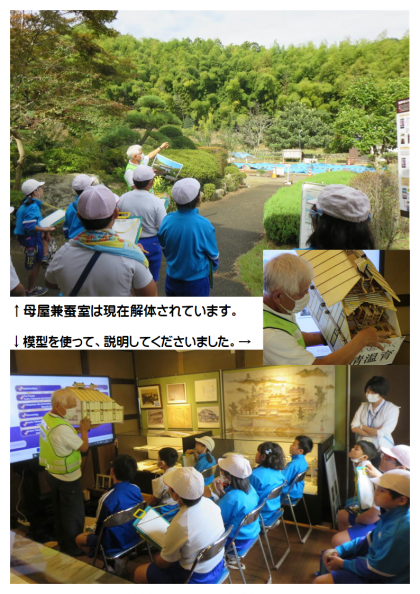 10月10日(火) 4年生「高山社跡見学」 公開日 2023/10/10 更新日 2023/10/10 できごと 4年生が、地域が誇る世界文化遺産「高山社跡」の見学に出かけました。現在、母屋兼蚕室は今後の復元に伴い解体されていますが、模型を使って、清温育のしくみについて、ていねいに説明していただきました。スタッフの皆様には、たいへんお世話になりました。