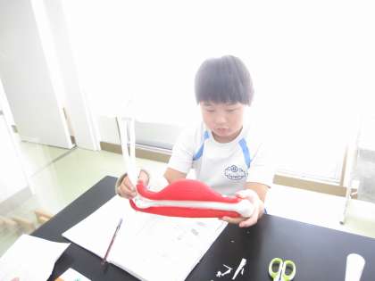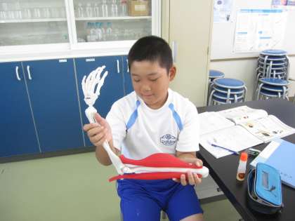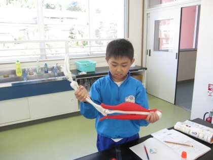 10月11日(水)4年理科 わたしたちの体と運動(その2) 公開日 2023/10/11 更新日 2023/10/11 できごと うでのきん肉は、うでの上下にあり、2本のほねをつなぐようになっていました。きん肉がちぢんだり、ゆるんだりしてほねを動かすことによって、うでが動くことがわかりました。