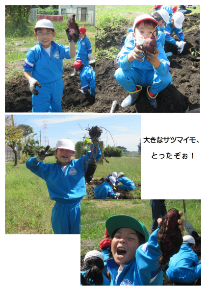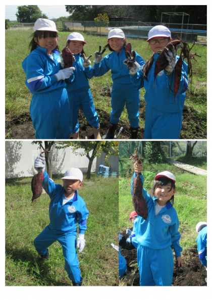 10月11日(水) 1・2年生の生活科「サツマイモほり」(3) 公開日 2023/10/11 更新日 2023/10/11 できごと 畑のあちらこちらから、「先生、とったよ!」と元気な声が聞こえてきます。2年生も大収穫です!みんな収穫したサツマイモを片手に「笑顔いっぱい」です。最高の芋掘り日和でした。