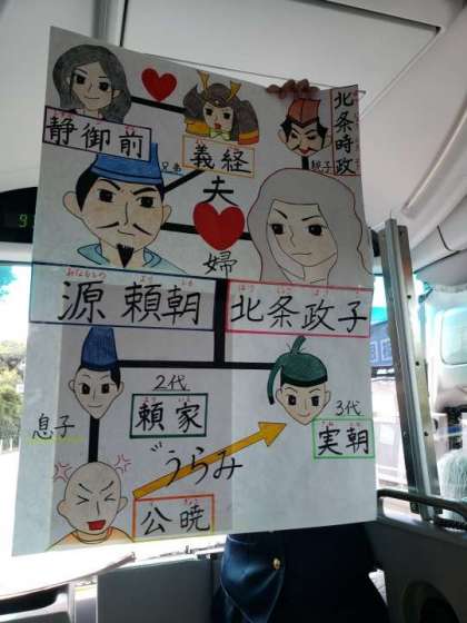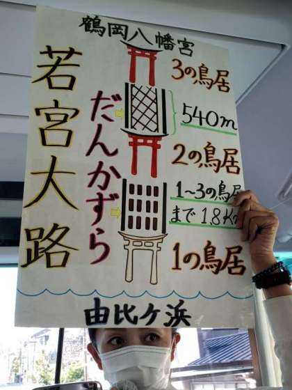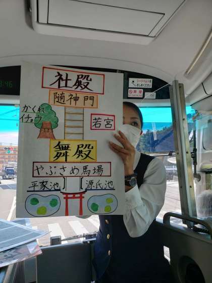 10月18日(水) まもなく鎌倉へ到着 公開日 2023/10/18 更新日 2023/10/18 できごと バスガイドさんが手づくりのイラストで鎌倉について説明してくださっています。とてもわかりやすい説明に、子どもたちは聞き入っています。
