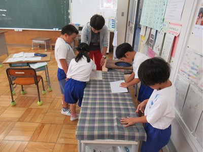 自分の持ち物を使って、いろいろなものの長さを調べました。「給食台は、下敷きいくつ分」や、「絵本は、鉛筆のいくつ分」などいろいろな方法で調べました。消しゴムで調べた子もいました。