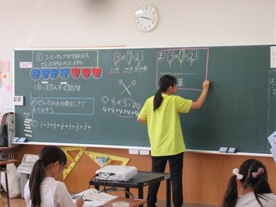 10月19日(木)2年生の算数 公開日 2023/10/19 更新日 2023/10/19 できごと 2年生の算数では、「かけ算」の学習をしています。今日は、かけ算の考え方について学習しました。 「1つ分」×「いくつ分」=「全部の数」になることを学びました。
