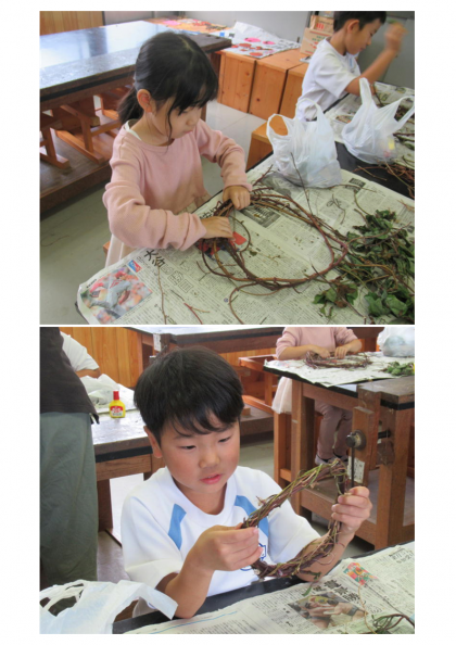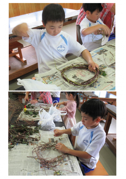 10月20日(金) 1年生「フォレストリースクール」(1) 公開日 2023/10/20 更新日 2023/10/20 できごと 1年生は生活科の時間に、群馬県環境森林部より講師の先生に来校いただき、「フォレストリースクール」を行いました。1年生が生活科の時間に育ててきたアサガオのつるを使ってリースづくりです。子どもたちは、講師の先生の話をよく聞いて、一生懸命リースづくりに取り組んでいました。
