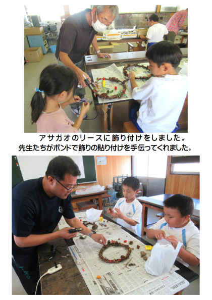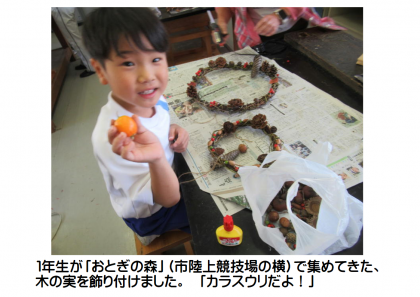 10月20日(金) 1年生「フォレストリースクール」(2) 公開日 2023/10/20 更新日 2023/10/20 できごと 木の実を飾り付けて、とってもすてきな「世界に一つだけのリース」が完成しました。出来上がった作品をお楽しみに!