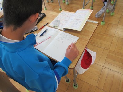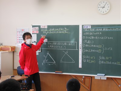10月23日(月)6年生の算数 公開日 2023/10/23 更新日 2023/10/23 できごと 6年生の算数では、図形の学習をしています。今日は、「方眼を使わない拡大図と縮図の書き方を考えよう」というめあてで学習していました。 今日は、コンパスと分度器を使って、拡大図を書く学習をしました。次回は、今回の学習を応用して「縮図」の書き方を学習します。