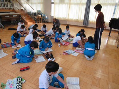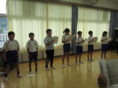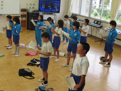今日は、4,5年生が合同で音楽の授業をしました。11月に行われる小中音楽発表会で歌う合唱の練習をしました。