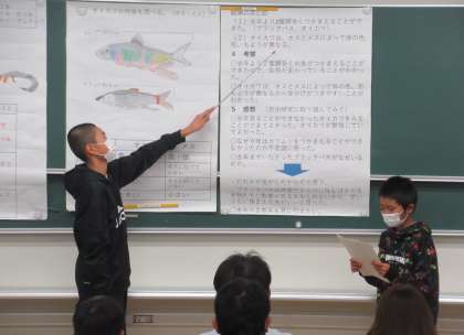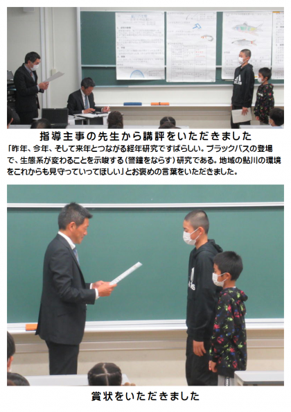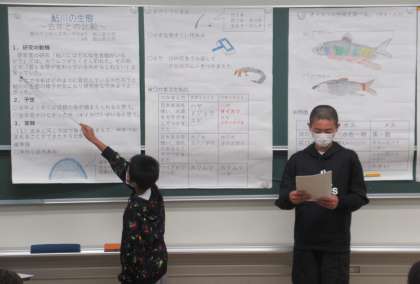 一つ目の研究発表は、6年生と3年生の兄弟による研究「鮎川の生態〜去年との比較〜」でした。昨年と今年の鮎川の生態(とれる魚)を比較し、外来種(ブラックバス)の出現で鮎川の生態系が今後変化していくかもしれないことを示唆する(警鐘をならす)研究でした。地域の鮎川の環境を大切にしていきたいという願いがこめられたすばらしい研究発表でした。