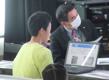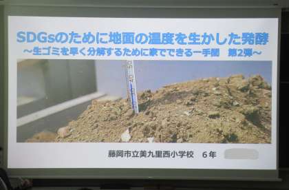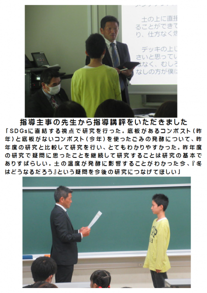 底板があるコンポスト(昨年)と底板がないコンポスト(今年:地面の温度を生かしたもの)を使った生ゴミの発酵の早さについて、昨年度の研究と比較して研究を行い、地面の温度が発酵に影響することが明確になったとてもわかりやすい研究発表でした。発表後の指導主事の先生による指導講評では、「昨年度の研究で疑問に思ったことを継続して研究することは研究の基本でありすばらしい。土の温度が発酵に影響することがわかった今、『冬はどうなるだろう』という疑問を今後の研究につなげてほしい」とお褒めの言葉と今後の研究に向けてエールをいただきました。