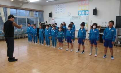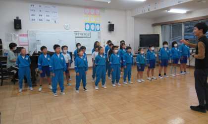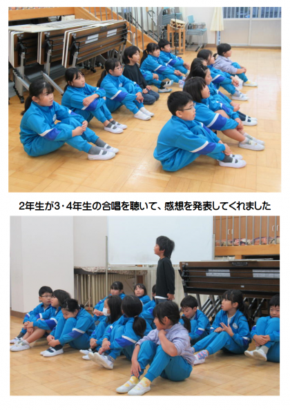 11月7日(火) 3・4年生が2年生に合唱を披露しました 公開日 2023/11/08 更新日 2023/11/08 できごと 表彰のあとで、3・4年生が2年生に「藤岡市小・中学校音楽発表会」で歌う合唱を聴いてもらいました。社会科見学に出かけた5年生の分まで、4年生がアルトパートを頑張り、朝一番とは思えないほどの迫力ある合唱でした。3・4年生の合唱を聴いた2年生から「声が大きくてとても上手でした」と感想がおくられました。