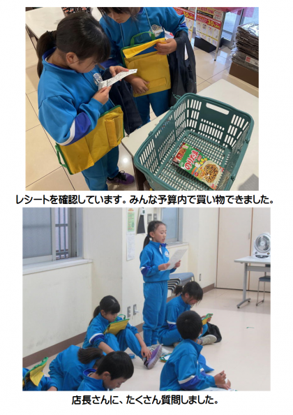 11月10日(金) 3年生の社会科見学「コープ藤岡店」(4) 公開日 2023/11/10 更新日 2023/11/10 できごと みんな予算内で買い物ができました。最後に、店長さんに聞きたいことを質問しました。全員が質問できました。