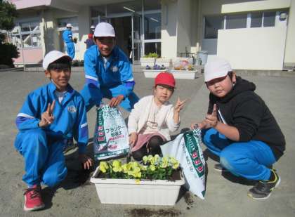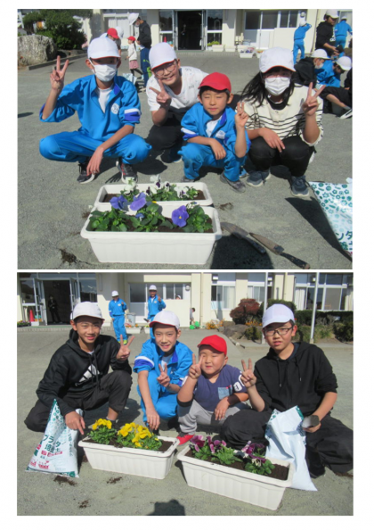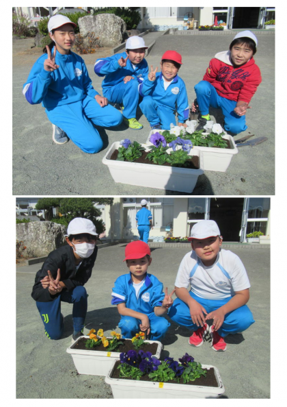 11月16日(木) 1年生&6年生「パンジー植え」(3) 公開日 2023/11/16 更新日 2023/11/16 できごと パンジー植えが終わって、6年生が1年生を囲んで記念写真を撮りました。みんなやさしい笑顔です。