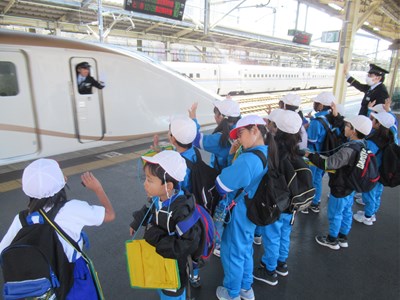 11月16日(木)2年生の生活科見学(10) 公開日 2023/11/17 更新日 2023/11/17 できごと 新幹線の見学をしている時、新幹線が何本も通過したり、停車したりしました。新幹線の車掌さんも子どもたちに、手を振ってくれました。 子どもたちを案内してくれた駅員さんは、子どもたちに帽子をかぶらせてくださいました。みんなとても似合っていました。