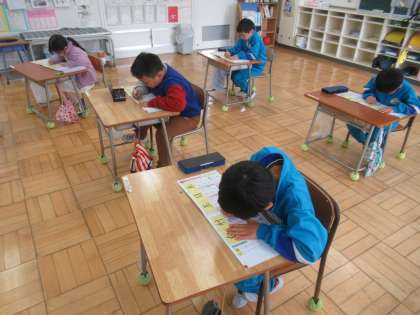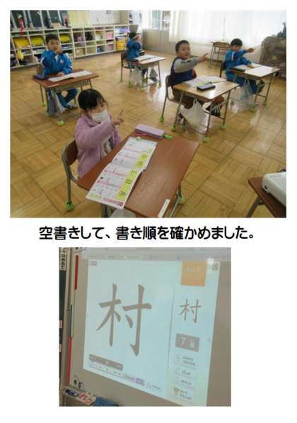 1月16日(火) 1年生の国語 公開日 2024/01/16 更新日 2024/01/16 できごと 1年生の国語では、新しい漢字を学習していました。まず、空書きして、書き順を確かめ、漢字ドリルに練習しました。子どもたちは、一字一字ていねいに練習し、先生に○をつけてもらいました。