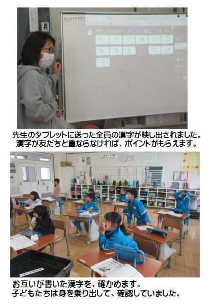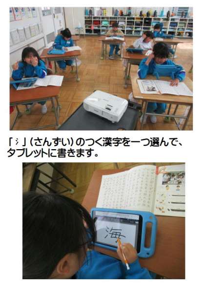 2年生の書写では、漢字の「へん」の画数を確かめながら、これまで学習した漢字を復習していました。先生が、「3画のへん、氵(さんずい)を使った漢字を一つ書いてください」とお題を出して、書いた漢字が友だちが書いた漢字と同じにならなければ、ポイントがもらえます。子どもたちは、「どれにしようかな」「よし、これにしよう」などと言いながら、これまで学習した漢字を思い出したり、教科書で確認したりしながら、楽しそうに学習に取り組んでいました。