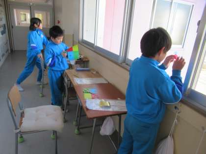 2月2日(金) 4年生の図工(1) 公開日 2024/02/02 更新日 2024/02/02 できごと 5・6時間目、4年生は廊下に机を出して、窓から外をのぞいて、作品づくりをしていました。今日の学習のタイトルは「まどをのぞいて」です。窓から望む風景に、自分の作品(色シートを切り取って形づくったもの)を重ねていきます。子どもたちは発想豊かに、作品づくりを楽しんでいました。