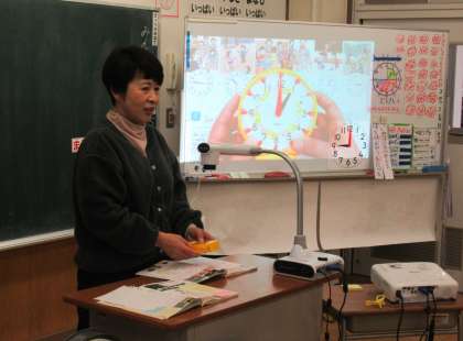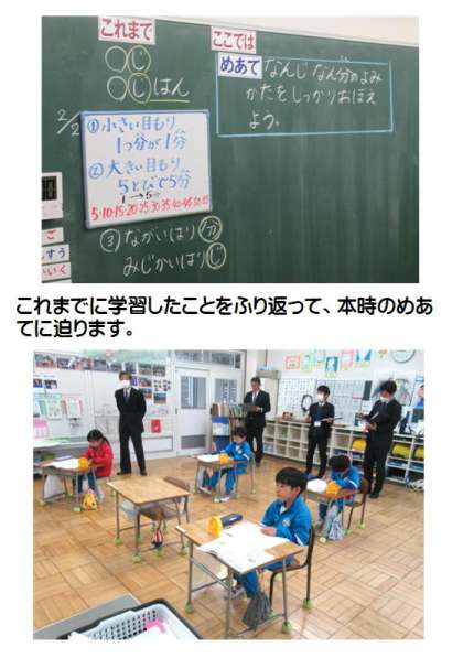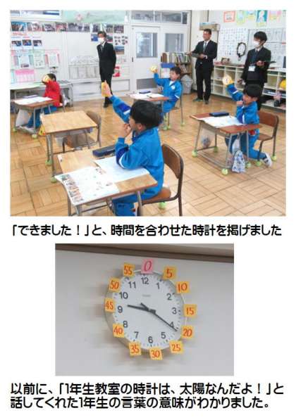 1年生の算数では、めあて「何時何分のよみ方をしっかりおぼえよう」の学習に取り組んでいました。子どもたちは具体物(時計)を手にして、先生から出題された時刻に針を動かしたり、時刻を読み取ったりして、楽しく学習していました。「先生、できました!」とみんな自信満々でした。