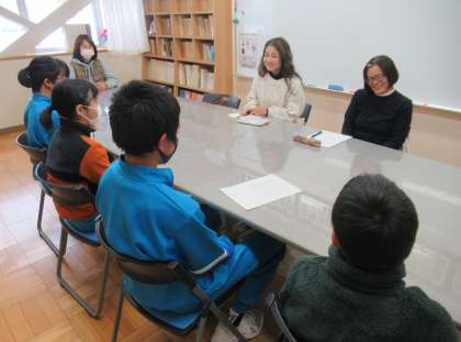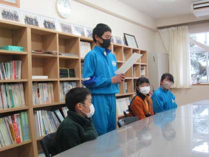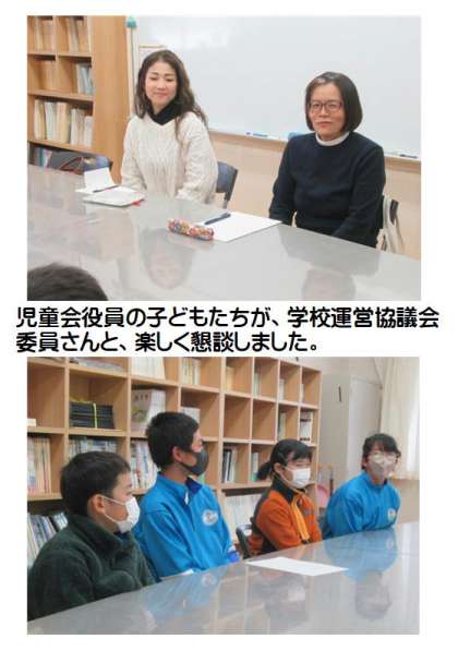 本日6校時、委員会活動の時間に、美九里西小学校担当の2名の学校運営協議会委員さんに来校いただき、児童会本部役員の子どもたちと「EAST子育てアクションプラン情報交換会」を行いました。昨年7月に続き、今年度2回目の開催となります。今日は、子どもたちが、今年度の「子どもたちの取組」について、学校運営協議会委員さんに発表し、感想や激励をいただきました。すっかり顔なじみになった委員さんと和やかに懇談する子どもたちの笑顔が見られました。