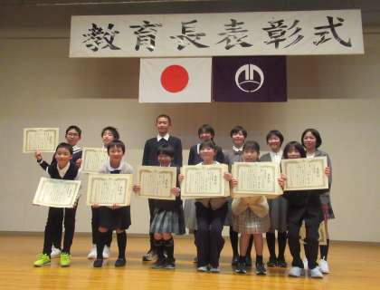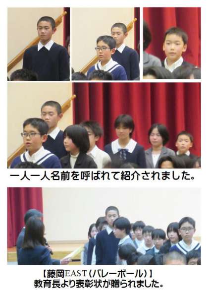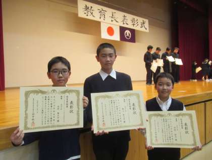 2月8日(木) 教育長表彰式 公開日 2024/02/08 更新日 2024/02/08 できごと 本日午後2時より、藤岡市民ホールにおいて「令和5年度教育長表彰式」が行われました。小学生から大人まで、総勢179名(うち小学生25名)の皆様が表彰されました。 本校からは、体育奨励賞として、社会体育「藤岡EAST(バレーボール)」で活躍した3名の児童(6年生2名、5年生1名)が表彰されました。2つの大会で県優勝をおさめた功績が讃えられました。おめでとうございます!