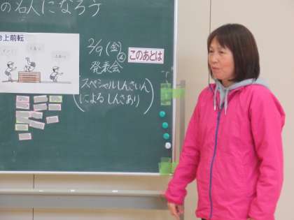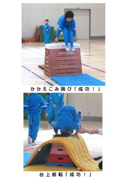 3・4年生の今日の体育は、3人の先生を審査員に迎えて「とびばこ発表会」が行われました。これまで練習に取り組んできた開脚跳び、台上前転、かかえこみ跳びに挑戦しました。審査のポイントは、踏み切り(ドン!)、手の付き(バン!)、着地(ふわっ!)の3点です。審査員による○が3つそろうと「成功!」です。みんな「やる気いっぱい」、果敢に挑戦しました。