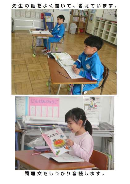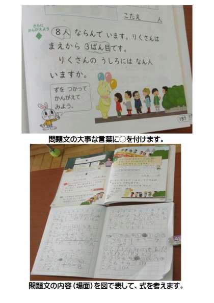 2月13日(火) 1年生の算数 公開日 2024/02/13 更新日 2024/02/13 できごと 1年生の算数では、文章問題の内容(場面)を図で表して、式を考える学習に取り組んでいました。子どもたちは一人一人、問題文をしっかり音読して、大事な言葉に○をつけて、ノートに図をかいて、自分で式を立てて答えを導き出していました。1年生のこの1年間の成長に感心しました。