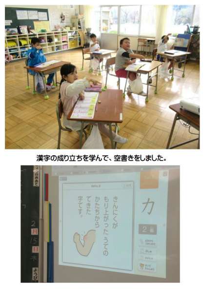 2月15日(木) 1年生の国語 公開日 2024/02/15 更新日 2024/02/15 できごと 1年生の国語では、新しい漢字「左」「力」の学習をしていました。漢字の成り立ちを学び、空書きで筆順を確認します。形を整えるポイントもしっかり意識して練習していました。また書く姿勢もよかったです。