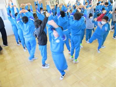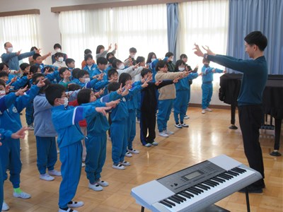 2月20日(火) 音楽集会(1) 公開日 2024/02/20 更新日 2024/02/20 できごと 今日の業前活動では、3学期初めての音楽集会を行いました。今日は、「翼をください」と「この星に生まれて」という曲を合唱しました。合唱をする前に、音楽主任の先生からよい声を出しやすくする体操を教えていただき、みんなでやってみました。