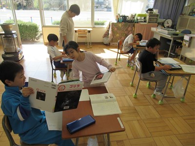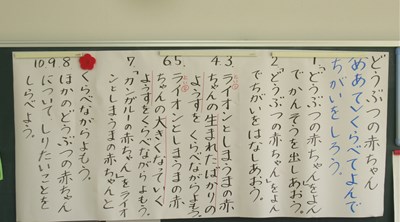 2月20日(火) 1年生の国語(1) 公開日 2024/02/20 更新日 2024/02/20 できごと 1年生の国語の授業では、「どうぶつの赤ちゃん」という文章を学習しています。この学習の大きなめあては、「くらべて読んでちがいを知ろう」です。今日の授業のめあては、「ほかのどうぶつの赤ちゃんについて知りたいことを調べよう」でした。教科書で紹介されたもの以外の動物について、担任の先生が用意してくれた学校図書館の本を読んで調べました。