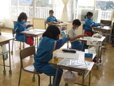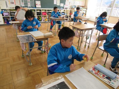 2月20日(火) 4年生の図工 公開日 2024/02/20 更新日 2024/02/20 できごと 4年生の図工では、「木版画」の学習が始まりました。今回は、自画像の木版画をつくるそうです。今日は、薄い紙に、自分の顔写真を重ね合わせ、ていねいに写し取っていきました。素晴らしい作品ができるのを楽しみにしたいと思います。