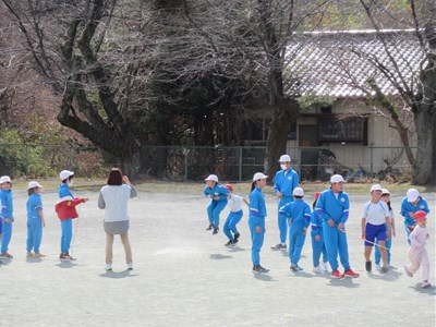 高学年の児童が長縄を回し、その他の児童が縄を跳びます。なかなかタイミングよく入っていけない子に、周りの子どもたちが「今っ!今っ!」とタイミングを教える声を出していました。その子が思い切って飛び込み、縄跳びを成功させると、班のみんなから賞賛の声があがりました。