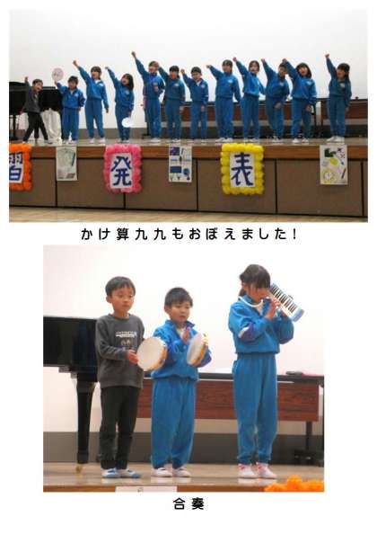 2月22日(木) 学習発表会:2年生「できたよ 2年生!」(2) 公開日 2024/02/23 更新日 2024/02/23 できごと 2年生も大きな声で発表したり、ポーズを決めたり、元気いっぱいの発表でした。いろんなことができるようになりました。
