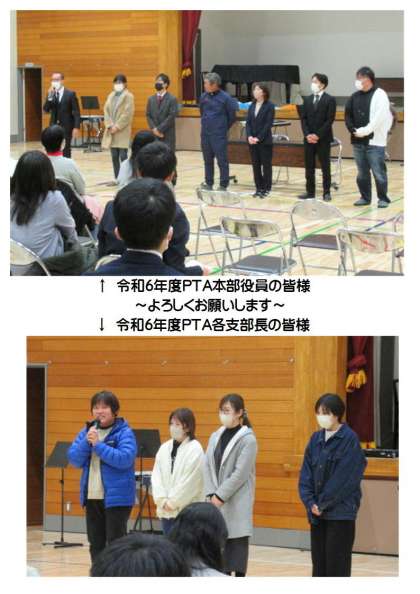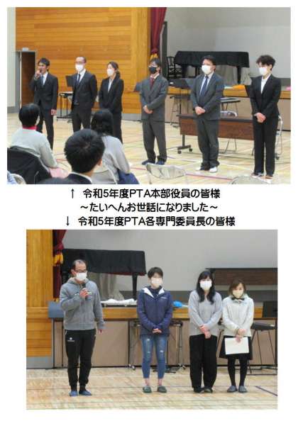 2月22日(木) PTA年度末総会 公開日 2024/02/24 更新日 2024/02/24 できごと 令和5年度PTA年度末総会が行われました。今年度の事業報告・決算報告の承認、来年度のPTA本部役員組織が承認されました。令和5年度PTA本部役員の皆様、各専門委員会の役員の皆様にはたいへんお世話になりました。また、全保護者の皆様には、本校PTA活動にご理解・ご協力いただきありがとうございました。