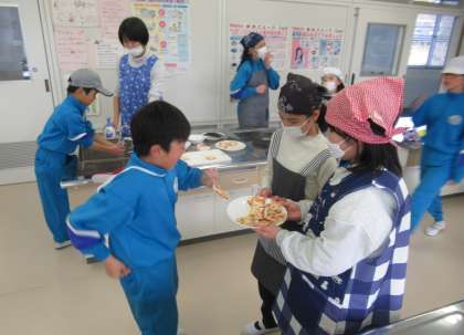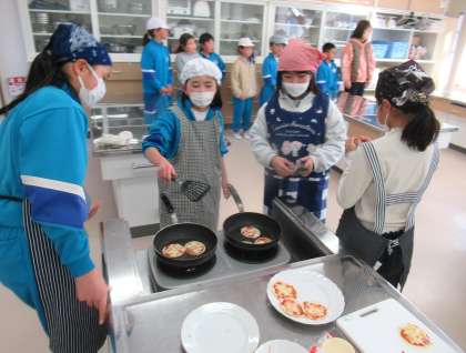 家庭科クラブでは、6年生が3年生に、家庭科クラブの活動内容について説明した後、今日の活動で焼いたピザを3年生にごちそうしてくれました。焼きたてのピザは温かくて、3年生から「おいしい!」という歓声があがりました。