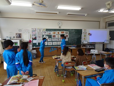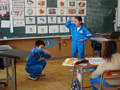 2月29日(木) 3年生の外国語活動 公開日 2024/02/29 更新日 2024/02/29 できごと 3年生の外国語活動の授業では、「友達と協力して劇をつくろう」というめあてで学習していました。英語で会話をしながら体を動かして、その様子が見ている人に伝わるように表現する学習でした。ペアごとに練習をし、みんなの前で発表し合いました。とても楽しそうな雰囲気の中で意欲的に英語の学習に取り組んでいました。