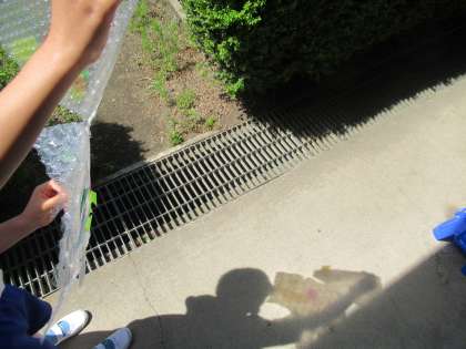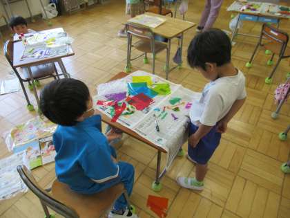 1・2年生の図工は「ひかりのプレゼント」。さまざまな色のセロハン紙を好きな形に切り、光を通すと楽しい見え方になる作品をつくる学習です。2年生が製作をしていると、その様子を1年生が真剣に見つめていました。早速ベランダで作品を日光に当て、確かめている子もいました。