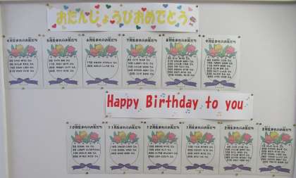 (写真中)保健室前に「おたんじょうびおめでとう!」と題して、全校児童の誕生日が紹介されています。養護教諭が作成してくれました。誕生日はとても大切な記念日です。みんなでお祝いしたいと思います。