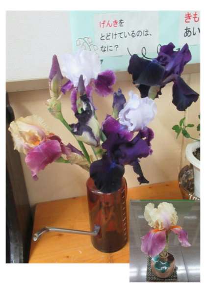 (写真下)教育委員会の皆様をお迎えするにあたり、校舎内のあちらこちらに素敵なジャーマンアイリスが飾られました。1・2年生の先生が自宅から持ってきてくれて、業務員さんが活けてくれました。「おもてなし」の心がこもっています。