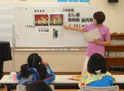 6月10日(月) 5・6年生「歯の出前講座」 公開日 2024/06/10 更新日 2024/06/10 できごと 5・6年生の「歯の出前講座」では、12才臼歯についてや歯と口の二大疾患「むし歯」「歯周病・歯肉炎」について学びました。そして、口の中のバイキンを除去するために効果的な歯みがきの仕方について練習しました。ぜひご家庭でも、歯みがきの仕方(今日の学び)について、お子さんと話題にしてみてください。