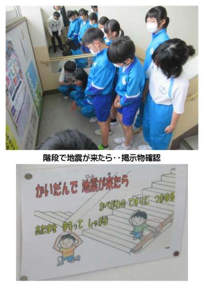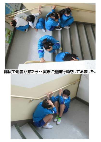 6年生は階段で実際に、身の守り方を実践してみました。いざというときに備えます。