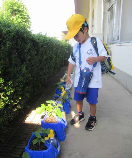 6月11日(火) 1年生のアサガオ 公開日 2024/06/11 更新日 2024/06/11 できごと 今日は朝から暑さが予想される天気です。1年生が登校後、真っ先にアサガオに水をあげていました。アサガオも水をあびて気持ちよさそうです。子どもたちも水分補給をしっかりして学校生活を送ります。