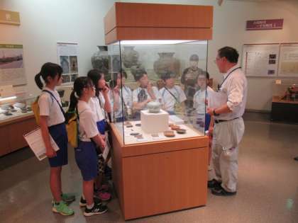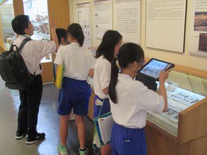 6月11日(火) 6年生:社会科見学(1)〜藤岡歴史館〜 公開日 2024/06/11 更新日 2024/06/11 できごと 6年生は藤岡歴史館(埋蔵文化財収蔵庫)に到着後、早速展示室を見学しました。旧石器〜近代までの貴重な遺物や史料が展示されています。古代のものだけでも土器や埴輪、金属器などがたくさんあり、昔からこの周辺が栄えていたことがうかがえます。子供たちは熱心に説明を聞き、自由見学時間ではタブレットで史料を撮影したり、メモを取ったり、担当の方に質問したりしていました。