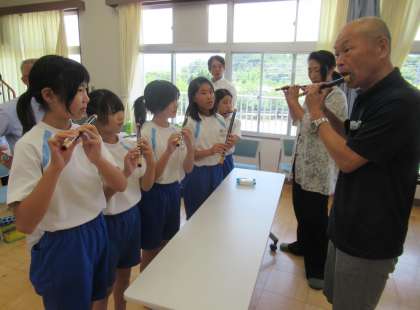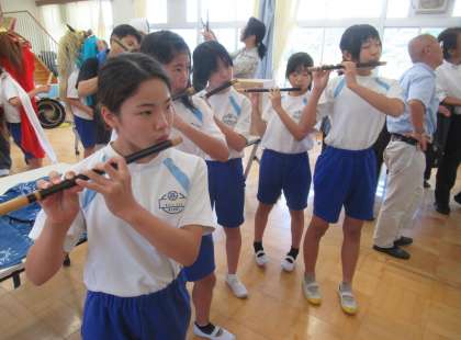 6月14日(金) 6年生「郷土芸能を学ぶ〜神田獅子舞保存会〜」(2) 公開日 2024/06/14 更新日 2024/06/14 できごと 授業の後半では、子どもたちが獅子舞(太鼓)や笛の演奏を体験しました。講師の皆様に指導していただきながら、真剣かつ楽しそうに取り組んでいました。笛の音を出すのはなかなか難しそうでしたが、練習を重ねるうちに笛の音色が聞こえてくるようになりました。さすが6年生です!