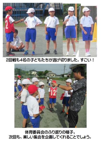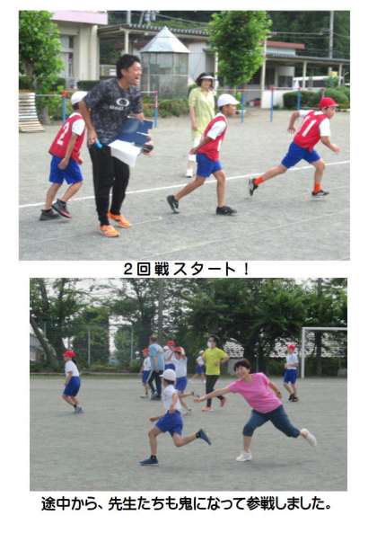 6月26日(水) 体育集会(2) 公開日 2024/06/26 更新日 2024/06/26 できごと 増え鬼2回戦目は、体育委員さんの鬼に加え、先生たちが鬼になって参戦しました。先生たちも必死に子どもたちを追いかけます。子どもたちの歓声が校庭に響き渡った楽しい時間となりました。