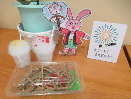 連日、真夏日が続く今日この頃、来校者玄関に西うさぴょん(美九里西小児童会公認キャラクター)の夏祭りバーションが飾られました。はっぴを来て校章入りのうちわを持った西うさぴょんの周りには、思わず食べたくなる屋台のかき氷と焼きそばが置かれています。