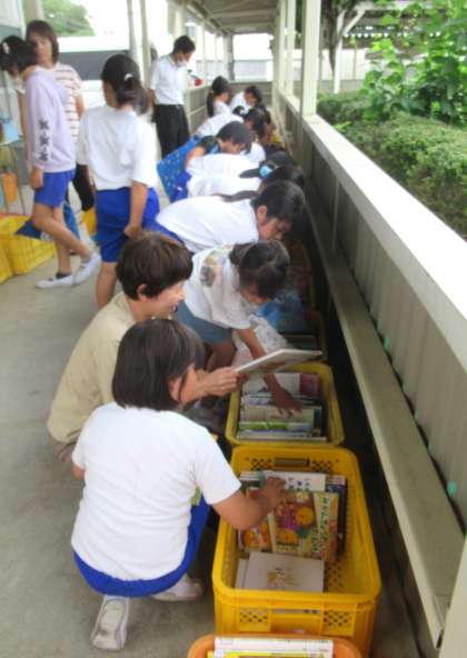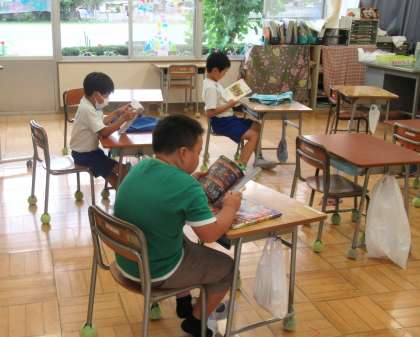 7月11日(木) 巡回図書 公開日 2024/07/12 更新日 2024/07/12 できごと 藤岡市図書館より巡回図書が来校しました。昼休みに、子どもたちが図書バッグを持って集まりました。「どの本にしようかな」・・子どもたちは本を手に取って見ながら、楽しそうに借りる本を3冊選んでいました。今回は、夏ならではでしょうか、ゆうれいやおばけ、妖怪の本を借りる子が多かったようです。 本を借りた後、早速、教室で読書に親しむ子どもたちの姿が見られました。