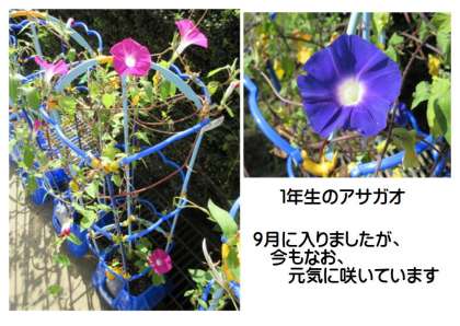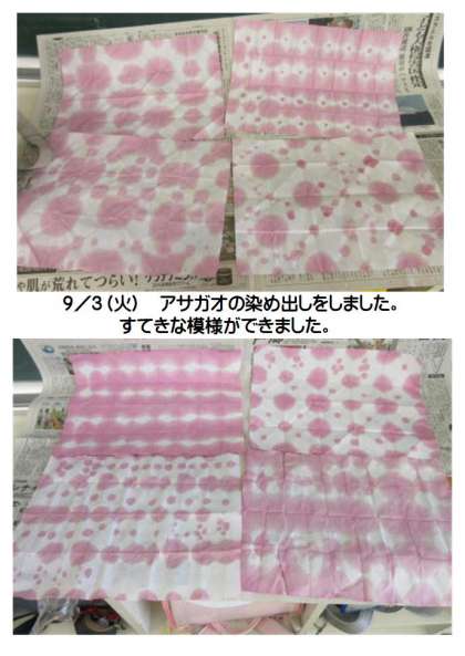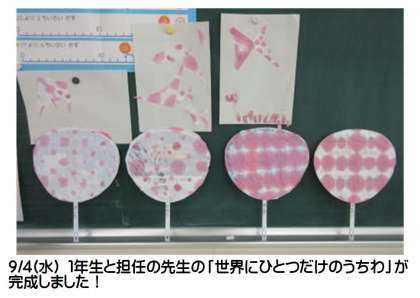 1年生が1学期から生活の時間に育て、夏休み中は自宅に持ち帰りお世話をしたアサガオの花の汁をしぼって、紙に染め出しを行いました。紙を折って、いろいろと試行錯誤しながらアサガオの汁につけてみたら、いろいろなすてきな模様ができました。染め出した紙をつかってうちわを作りました。「世界に一つだけのうちわ」が完成しました。まだまだ熱い日が続きます。アサガオうちわが大活躍することでしょう。