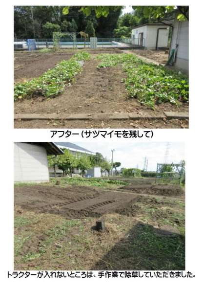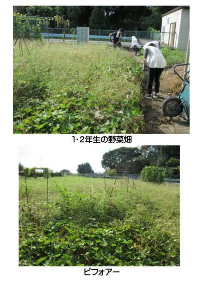 1・2年生の野菜畑、体育館南側通路の作業の様子です。1・2年生が秋に収穫するサツマイモに気を付けながら手作業で草を抜いていただきました。野菜畑も体育館南側通路も生い茂っていた雑草がなくなり、きれいになりました。