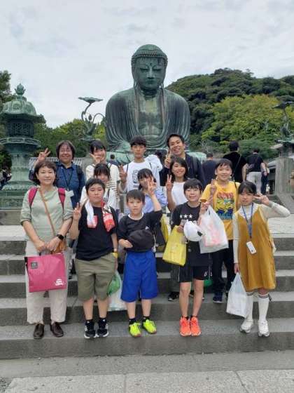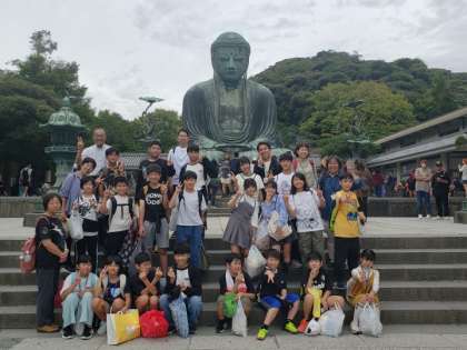 鎌倉大仏様と一緒に記念写真を撮りました。みんな笑顔いっぱいです。
