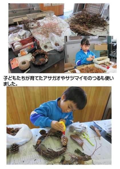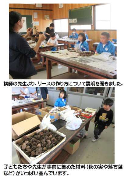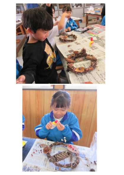 10月30日(水) 1・2年生「フォレストリースクール」(1) 公開日 2024/10/31 更新日 2024/10/31 できごと 群馬県「フォレストリースクール」より講師の先生をお招きして、1・2年生が手作りのリースづくりに挑戦しました。材料は、子どもたちが育てたアサガオやサツマイモのつる、公園で集めてきた秋の実(松ぼっくりやドングリ、紅葉した落ち葉など)など、自然のものばかりです。講師の先生の説明をしっかり聞いた後、早速リース作りが始まりました。写真は1年生の様子です。